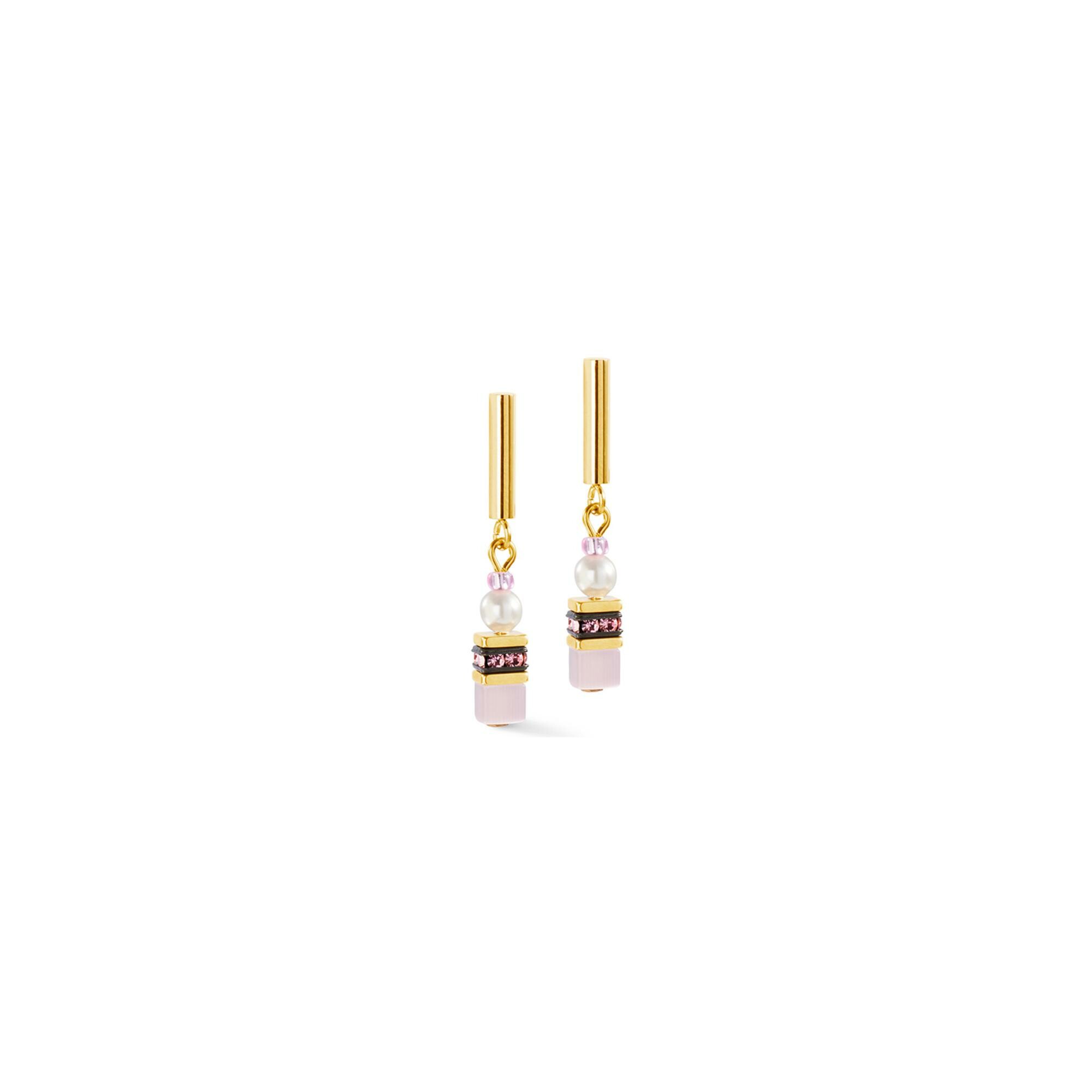 Boucles d'oreilles Coeur de Lion GeoCUBE Mini Fusion Pearls en acier doré, perles de cristal, oeil de tigre et strass Description détaillée